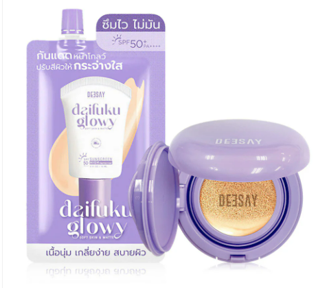 Deesay Set 2Items Feather Soft Blurring Cushion 13g #02 Natural + Daifuku Glowy Soft Skin & Matte SPF50 PA+++ 5ml Daifuku cushion and sunscreen set helps blur pores, conceals blemishes to look smooth, controls oil, is waterproof, and sweatproof, and helps protect the skin from sunlight.