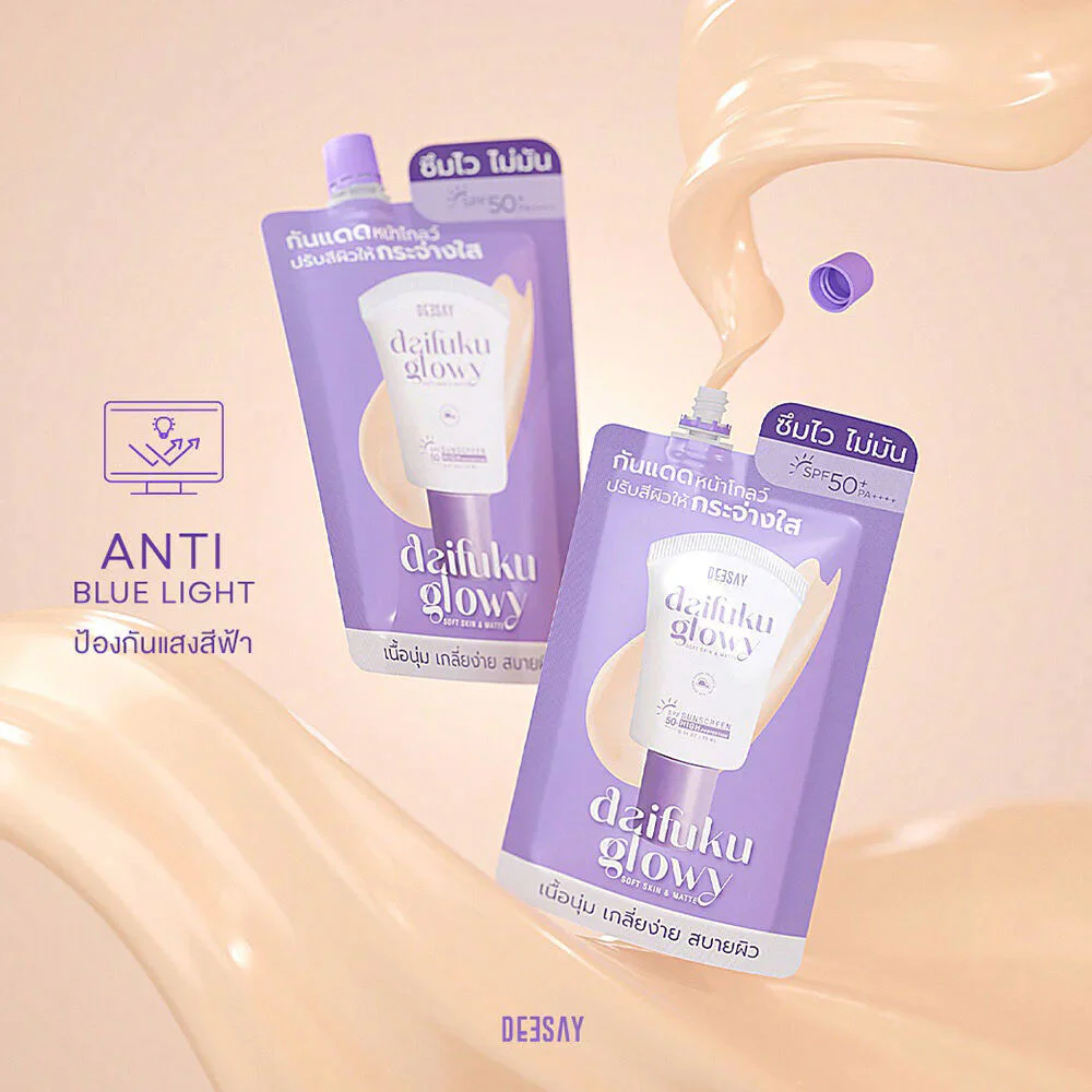 Deesay Daifuku Daifuku Glowy Soft Skin & Matte SPF50 PA+++ 5ml Daifuku sunscreen, soft texture, light, absorbs quickly, easy to spread, comfortable on the skin, controls oil, waterproof, sweatproof, helps protect the skin from sunlight and adjusts the skin to be bright and shiny as if with a filter, with more than 50 times protection with SPF 50 PA+++ with innovative Anti Blue Light and White Booster from Switzerland, combined with 11 Hyaluron molecules, adds moisture, has Anti Blue Light and Anti Pollution, protects against light from the screen and pollution.