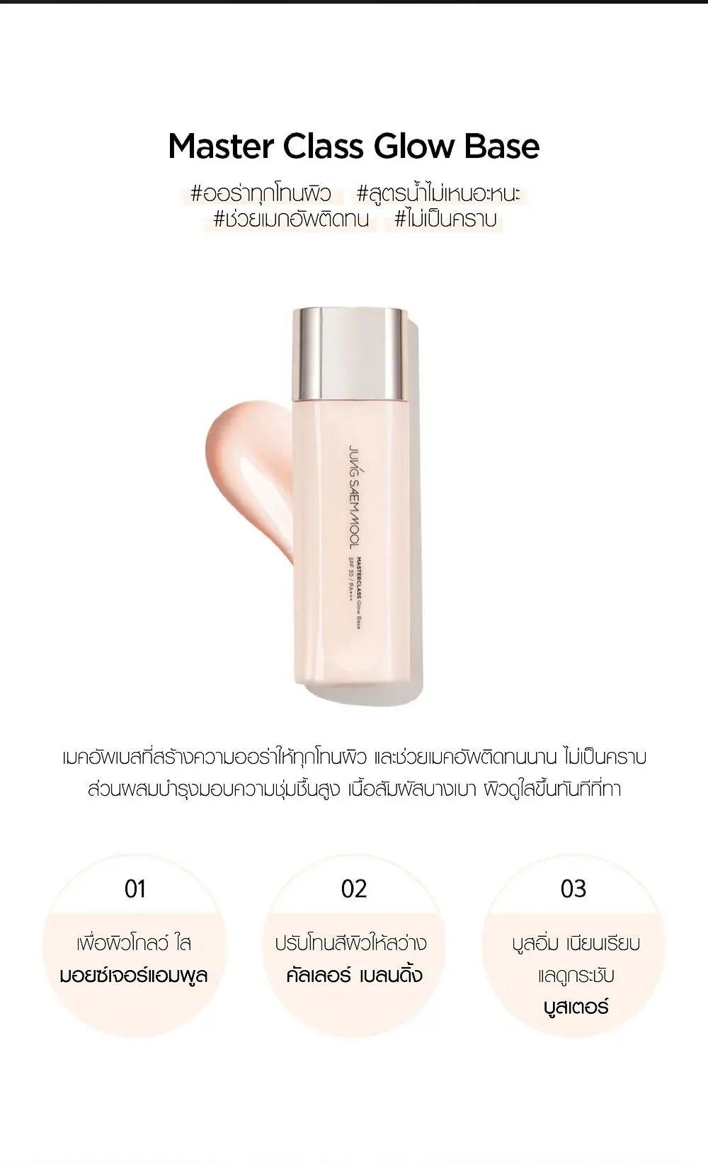 Jung Saem Mool Masterclass Glow Base SPF30 PA+++ 50ml Give your skin a dewy glow! With a dewy glow base Helps brighten your skin tone, combines a moisturizing ampoule, replenishes your skin with 3 layers of ampoule moisture, making your skin glow from within.