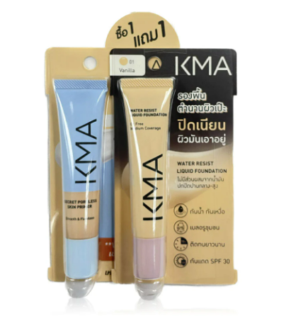 KMA Set 2 Items Secret Poreless Skin Primer 15ml + Water Resist Liquid Foundation 12ml #01Vanilla Perfect skin from every angle with a set of pore-blurring primer and foundation that covers perfectly. It has waterproof and sweatproof properties. It controls oil for a long time without smudging. It's suitable for hot weather and lasts all day.
