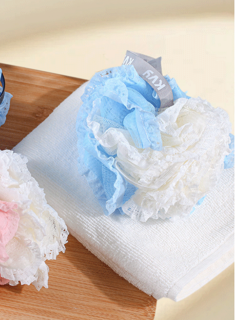 A blue bath scrub from KVY, stands out with its lace pattern, soft to the touch, non-irritating to the skin, helps cleanse and scrub the body at the same time.