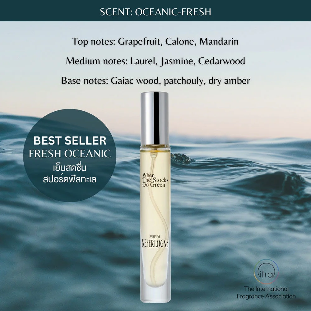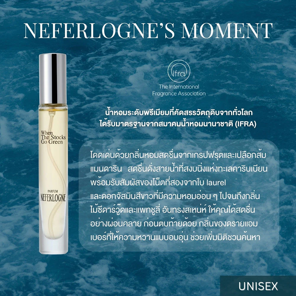 NEFERLOGNE When The Stocks Go Green Perfume 10ml Experience the scent of class with premium perfumes that select ingredients from around the world that have been certified by the International Fragrance Association (IFRA). Discover the distinctive scent of grapefruit and mandarin orange peel, as elegant as the calm waters of the Caribbean Sea. With the second note of laurel leaves and white jasmine with a light fragrance to the charming scent of cedarwood and patchouli, you will feel refreshed and relaxed. Before ending with the scent of dry amber that gives a warm sweetness, adding a dimension of variety, inviting you to explore and find the secrets hidden inside. It is a scent filled with victory, success and true celebration. The perfume can last up to 12 hours.