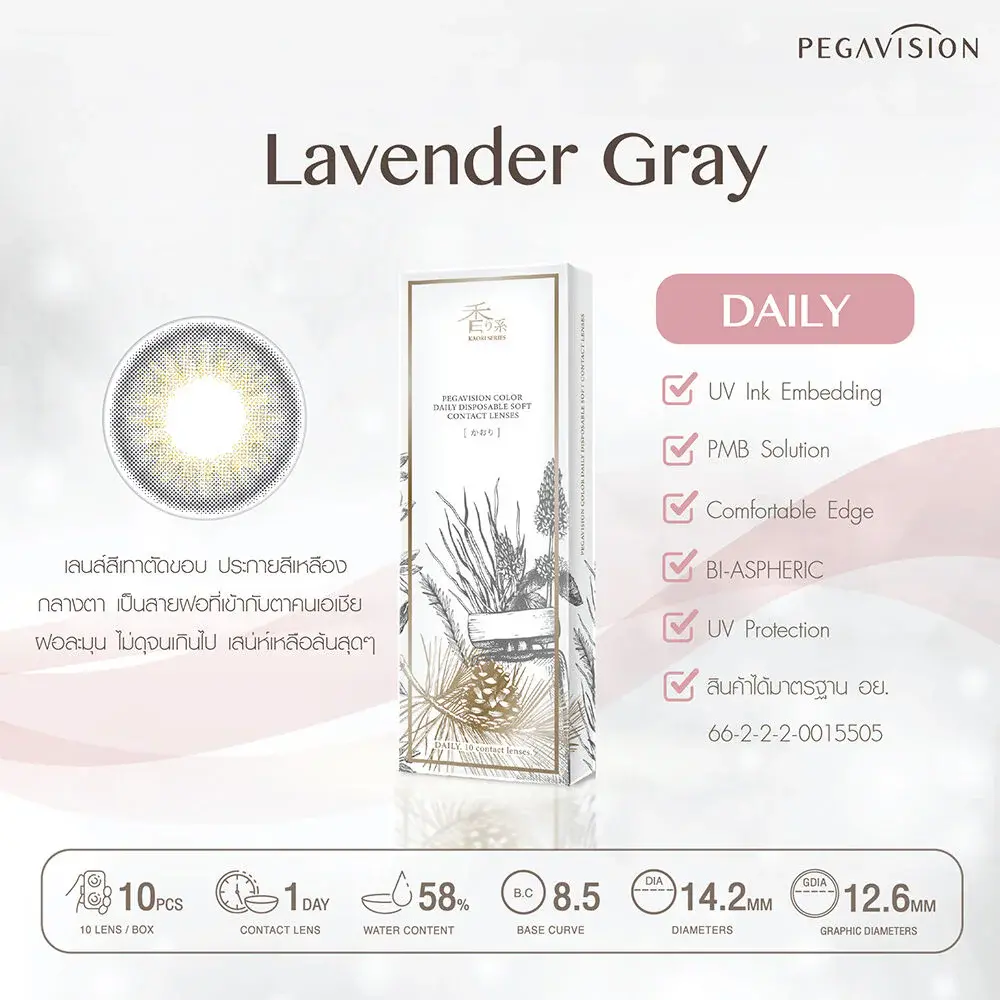 Pegavision Contact Lens Kaori Daily Lavender Gray [5 Pairs] #-2.75 5 pairs of daily contact lenses, gray lenses with yellow sparkles in the center of the eyes, with a blurred edge, adding softness. Wearing them does not make your eyes look fierce. They are Western-style lenses that suit Asians.